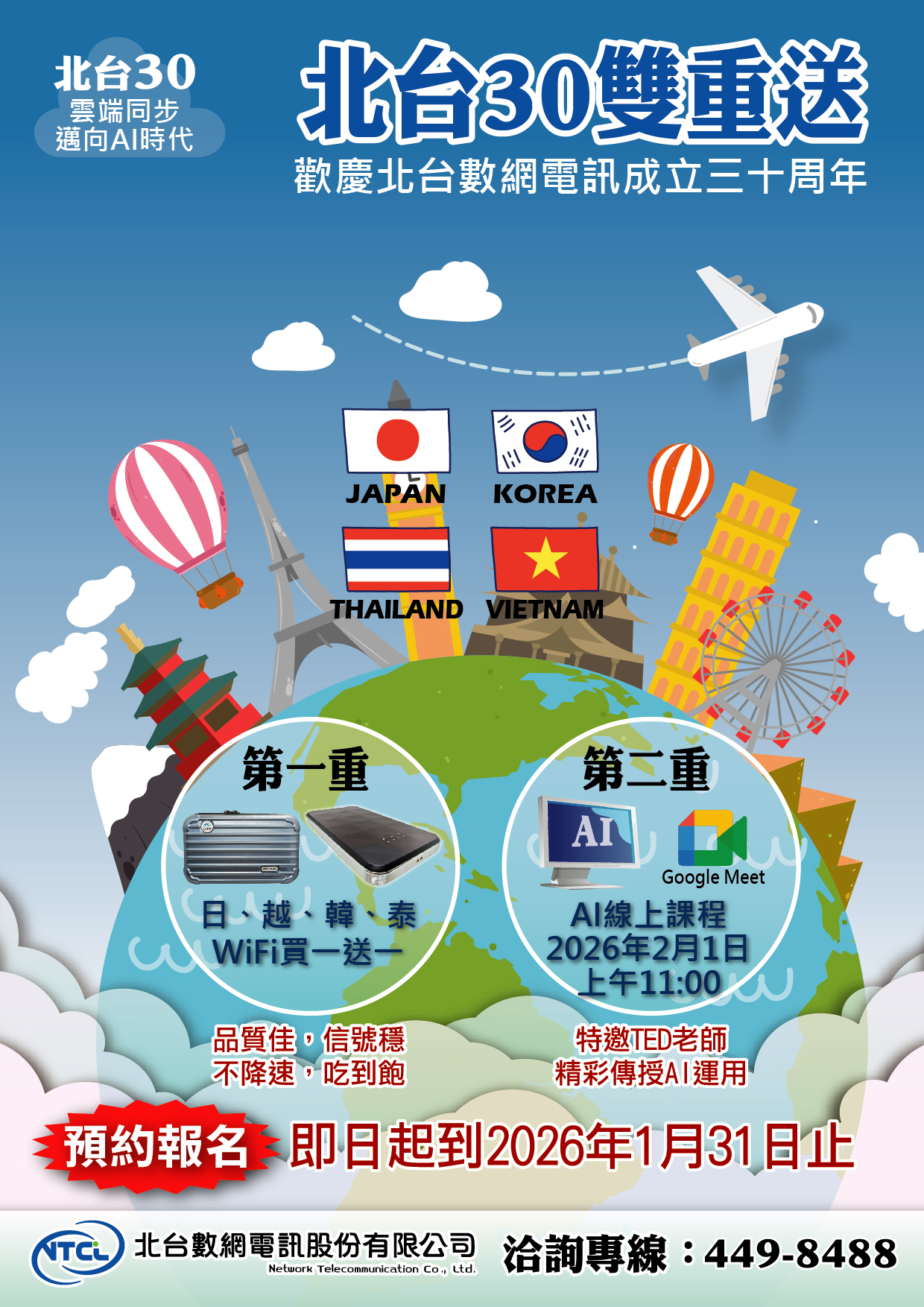 北台數網電訊從上個世紀創立至今已滿三十年,不僅見證著電訊業的轉變,也在轉變中,與時代同步,除了雲端通訊、上網,更增加雲端簡訊、傳真等多元化服務,在疫情遠距上班期間為許多企業客戶提供便捷服務。未來,我們也思索著各種AI整合項目,期盼與你共同前進AI新世代。